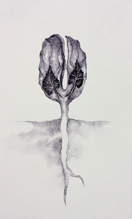 A splitting seed sinking its roots deep into the ground as it rises on a stalk above the earth with the smallest curl of a new leaf just becoming... more